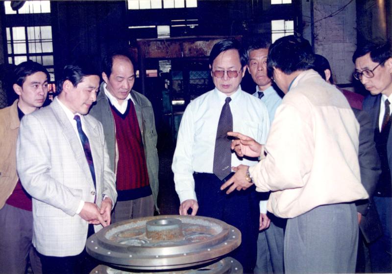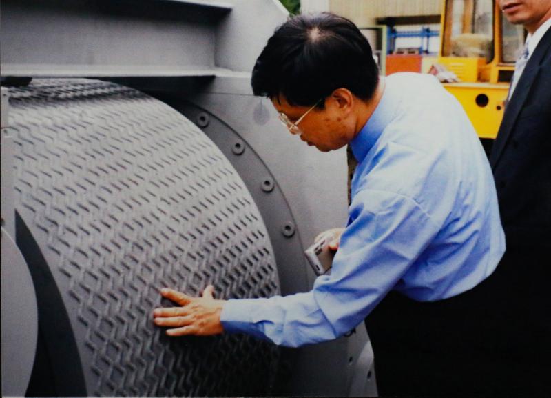 1999年,合肥院技術(shù)專家和領(lǐng)導(dǎo)們出國(guó)考察交流學(xué)習(xí)。圖為粉磨專家包瑋在研究輥壓機(jī)設(shè)備。